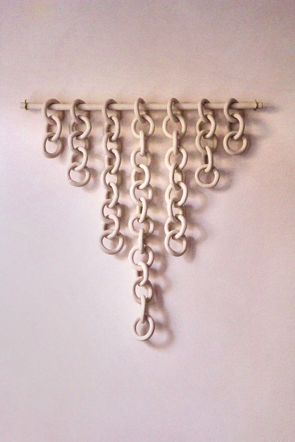 OOOOO is a collection of sculptural forms, hanging sculptures and lighting. Formed from unglazed white stoneware, all pieces feature a chain linked motif representing unity and connection. These hopeful sentiments are integral today in a world that feels ever more divided and disconnected.